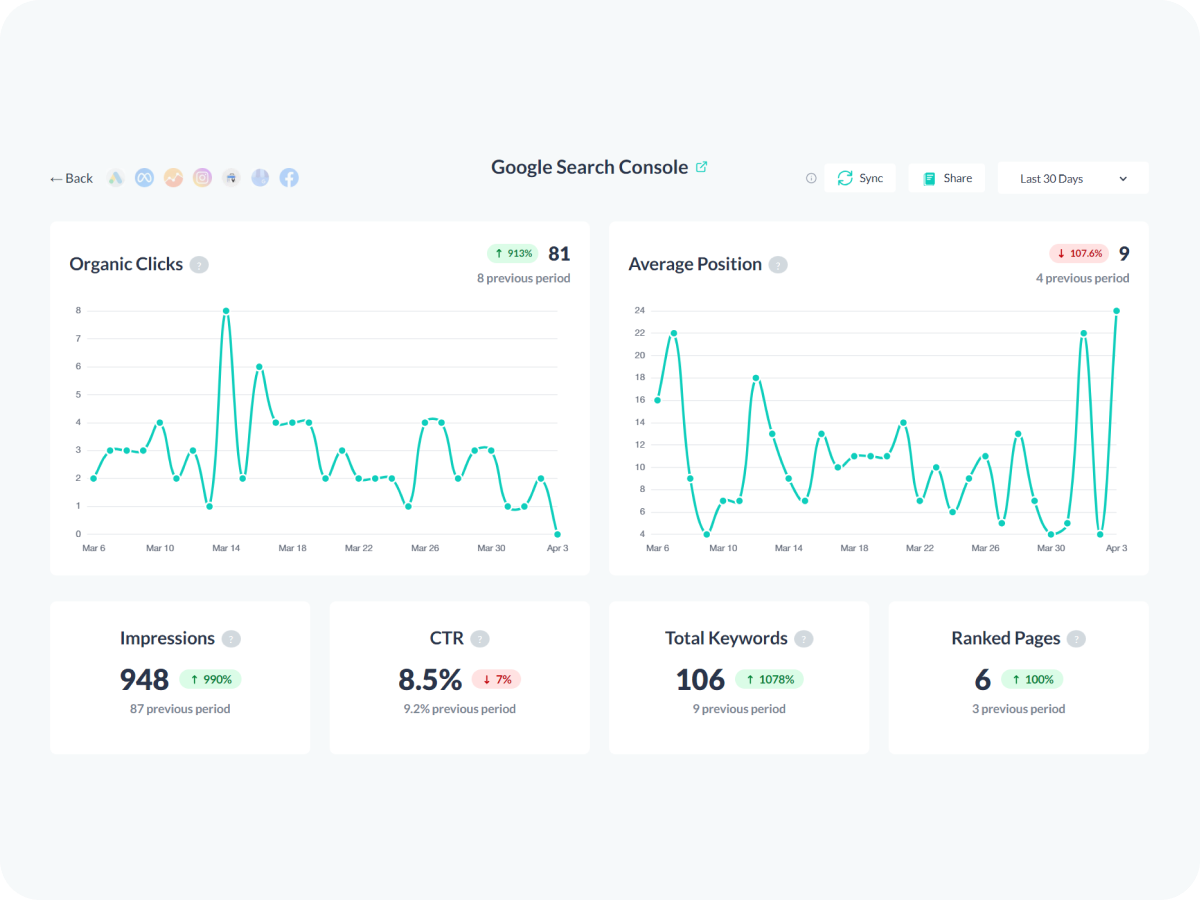 See how your site and rankings are growing with GA4, Search Console and Google Maps.